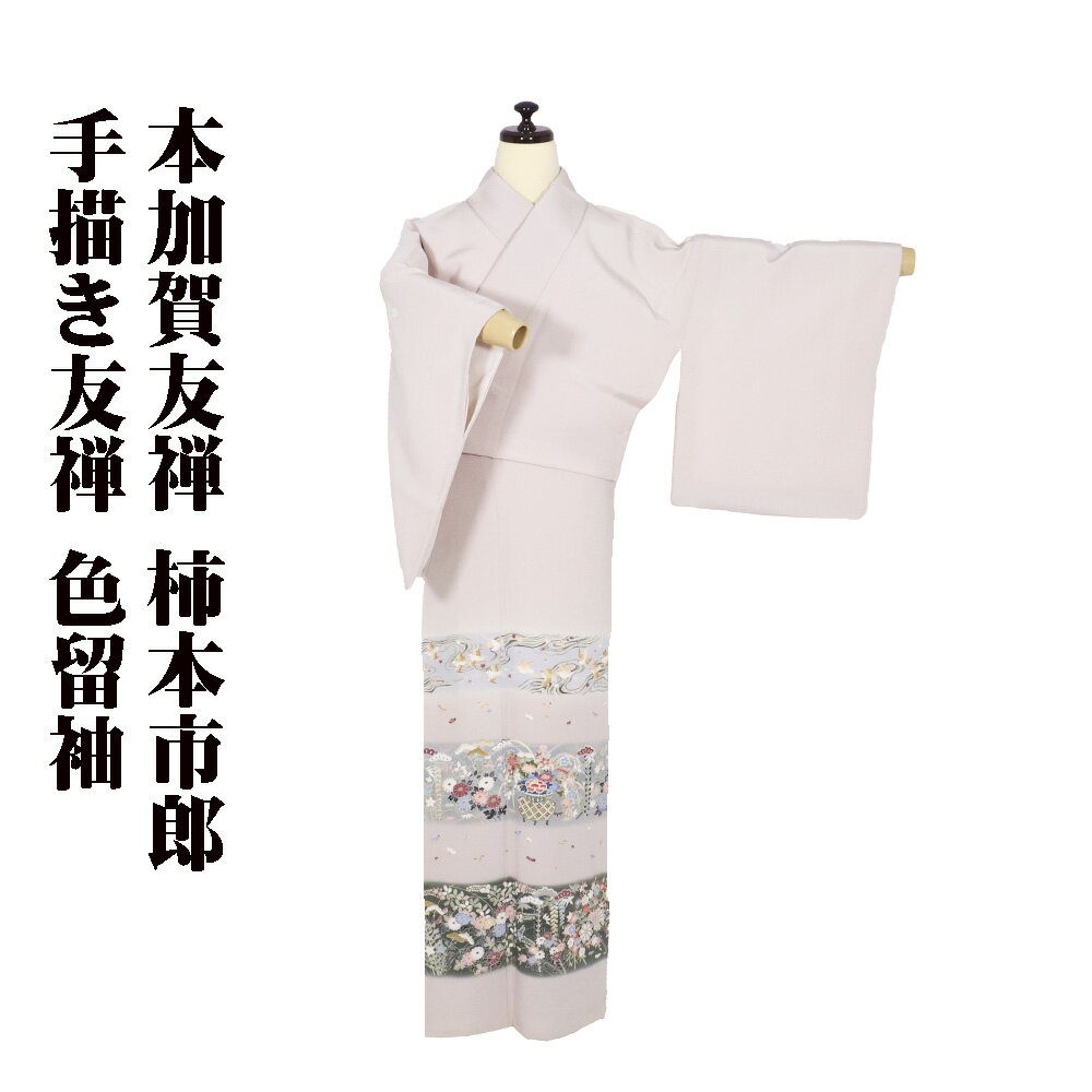\ 20%offクーポン / 本加賀友禅 柿本市郎氏作 色留袖 袷 正絹 ピンク 水色 緑 手描き友禅 花籠 花車 鳥 松竹梅 比翼仕立て Mサイズ ki30862 美品 送料込み