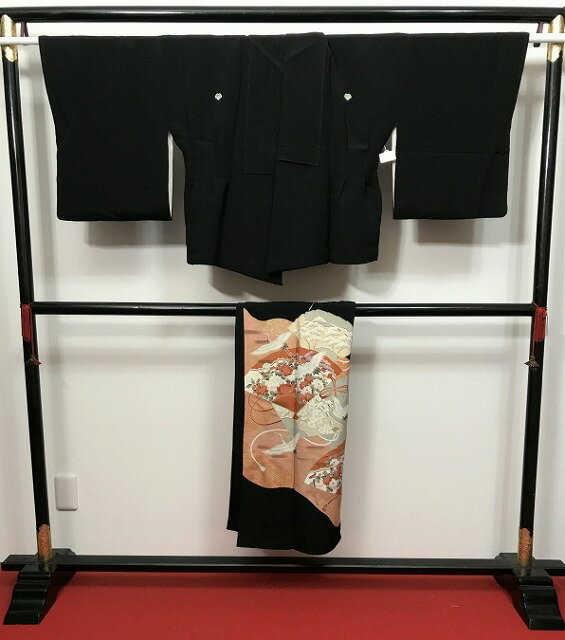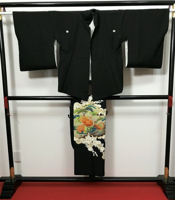 《楽天スーパーセール 半額 50%OFF》礼装 結婚式 親族 既婚 家紋 五つ紋 比翼仕立 クラレナ 家紋 蔦 広幅 鶴 笠松 藤 扇 正絹 黒留袖・袋帯・長襦袢(化繊)セット (ms1065) (USED品)【中古】リサイクル【和装】【着物】【女性】【留袖】