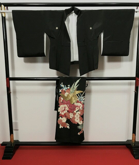 週末限定25%OFFCOUPON発行中/【中古】Sサイズ 正絹 留袖 黒地に草花鳳凰模様 五つ紋付 福服特製 リメイク黒留アンサンブル