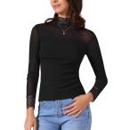 Allegra K レディース セミシアー メッシュトップ フィット レーストリム モックネック 長袖 ブラウス ブラック S