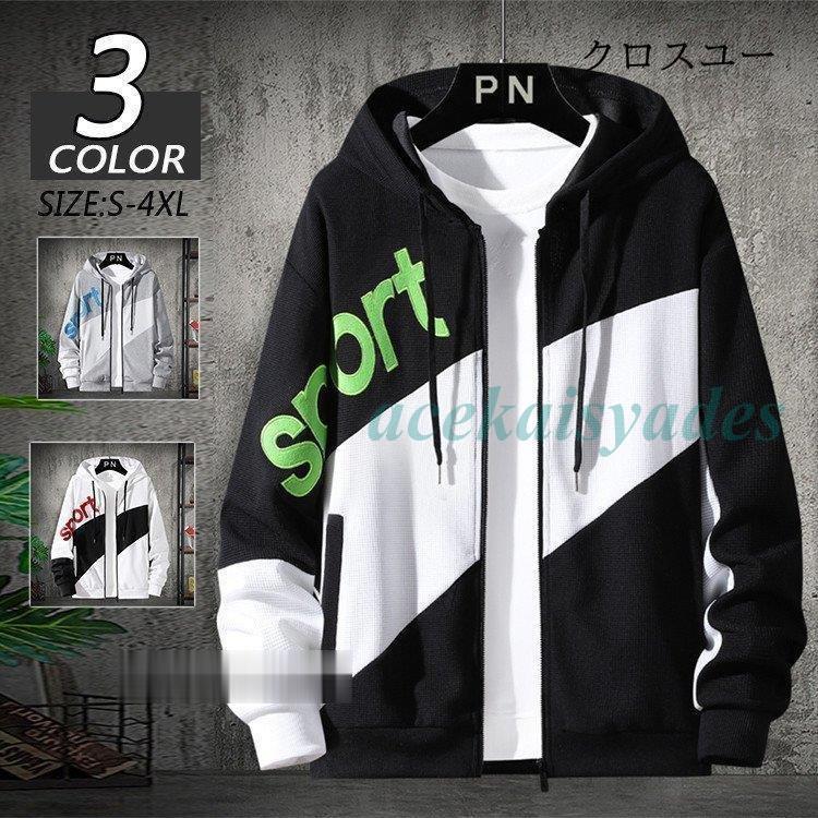 パーカー メンズ ジップアップ フード付き 長袖 切り替え 配色 春 秋 英語柄 おしゃれ カジュアル ワッフルチェック