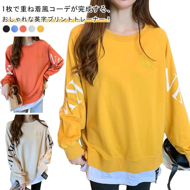 トレーナー 春 秋 英字プリント スウェット ロンT レディース プルオーバー 冬 重ね着風 トレーナー レイヤード Tシャツ 切り替え スリット入り トップス ゆったり 大きいサイズ おしゃれ 韓国風 カジュアル