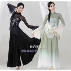 中華古典ダンス衣装 長袖 ラッパ袖 メッシュ チュール チャイナブラウス 竹プリント 斜め裾 サイドスリット チャイナ服 スカート風 ガウチョパンツ ワイドパンツ