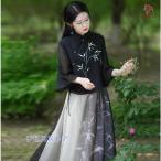 ナチュラルチャイナ服2点セット 黒系 水墨 改良漢服 チャイナドレス 中華服 セットアップ 竹 七分袖 チャイナブラウス ロング 水墨 グラデーション シフォンスカ