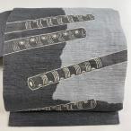 名古屋帯 逸品 落款あり 紬地 笛 灰色 正絹 中古