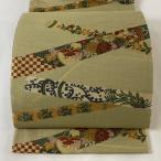 袋帯 美品 秀品 笛 草花 箔 灰緑 六通 正絹 中古