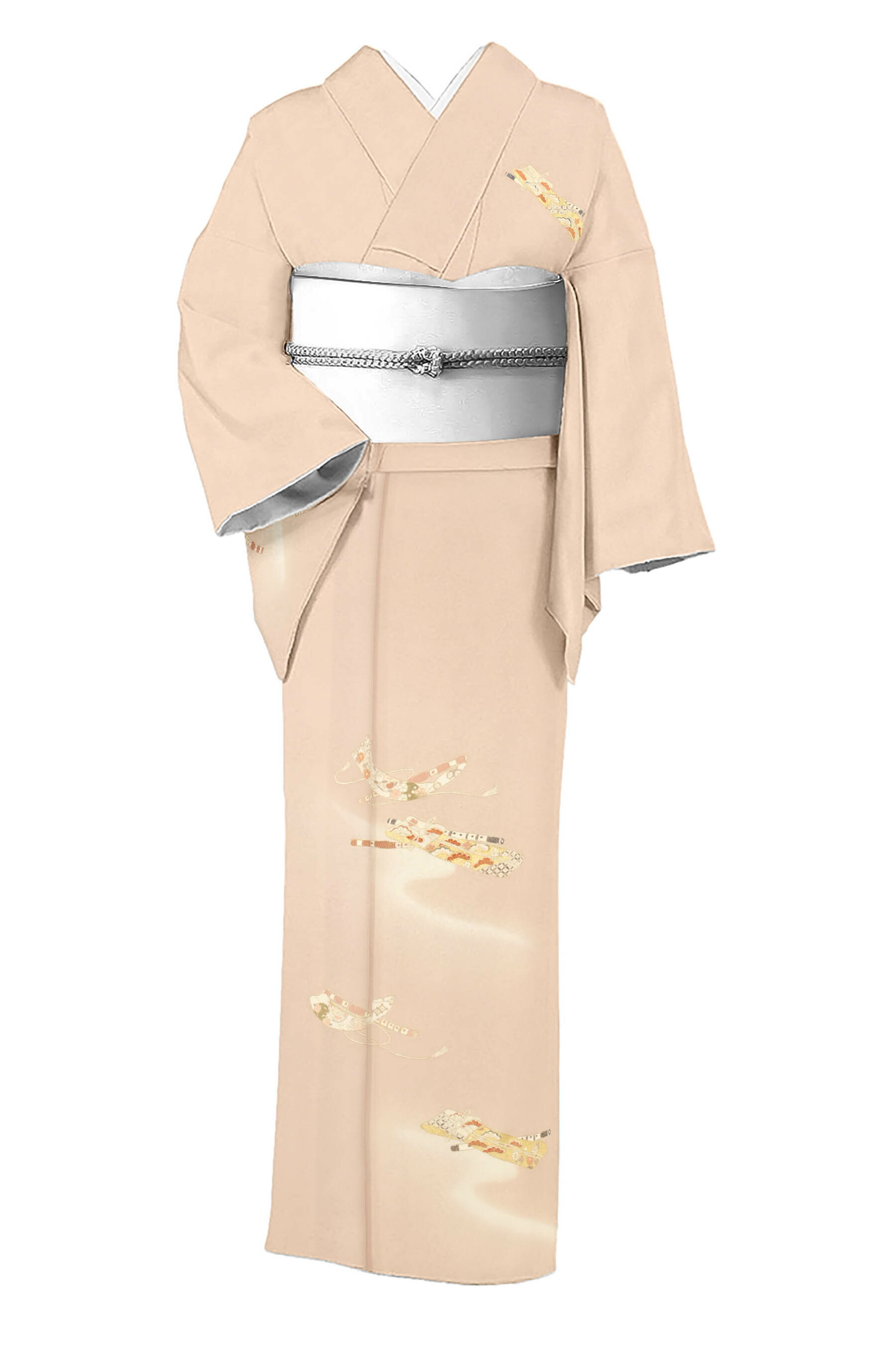 【大蔵ざらえ】 【京友禅一流染匠 今堀】 本手加工友禅付下げ着尺 <丹後ちりめん・特選「綾衣」地> 「霞に有職笛文・水柿色」 京が誇る真の手仕事! 控えめな気品がお付き添いに最適!