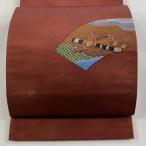 美品 袋帯 秀品 落款あり 関西仕立て 扇面 笛 金糸 刺繍 赤茶 お太鼓柄 正絹 中古