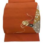 名古屋帯 名品 松葉仕立て 八寸名古屋帯 河村綴 共箱あり 笛 枝垂れ桜 金銀糸 刺繍 赤茶 正絹 中古