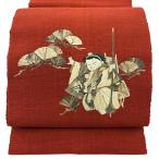 美品 名古屋帯 秀品 落款あり 田尾笛秋 松葉仕立て 八寸名古屋帯 童 松 茜色 正絹 中古