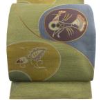 袋帯 秀品 鳥 草花 金銀糸 金通し 抹茶色 六通 正絹 中古