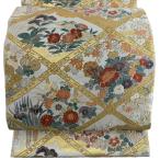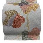 美品 袋帯 秀品 菱天井 草花 金銀糸 銀通し 灰白 六通 正絹 中古