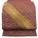 美品 袋帯 秀品 紬地 花柄 幾何学 金通し 赤茶 お太鼓柄 正絹 中古