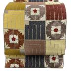 美品 袋帯 名品 紬地 幾何学模様 花 銀通し 茶色 全通 正絹 中古
