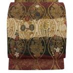 袋帯 名品 松竹梅 源氏香 金通し 唐織 茶緑色 六通 正絹 中古