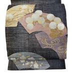 袋帯 秀品 紬地 扇面 草花 金銀糸 銀通し 黒灰 お太鼓柄 正絹 中古