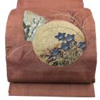 袋帯 秀品 紬地 満月 枝花 金通し 金糸 茶色 お太鼓柄 正絹 中古