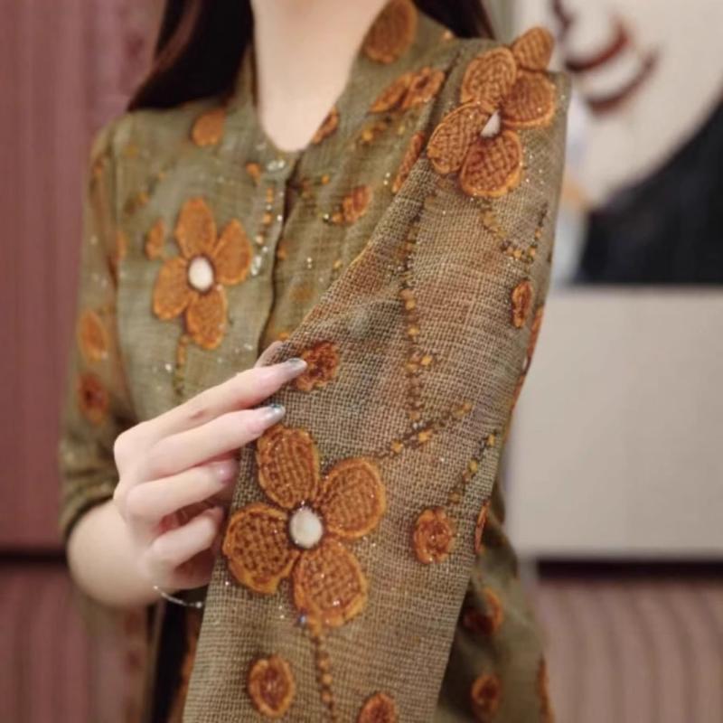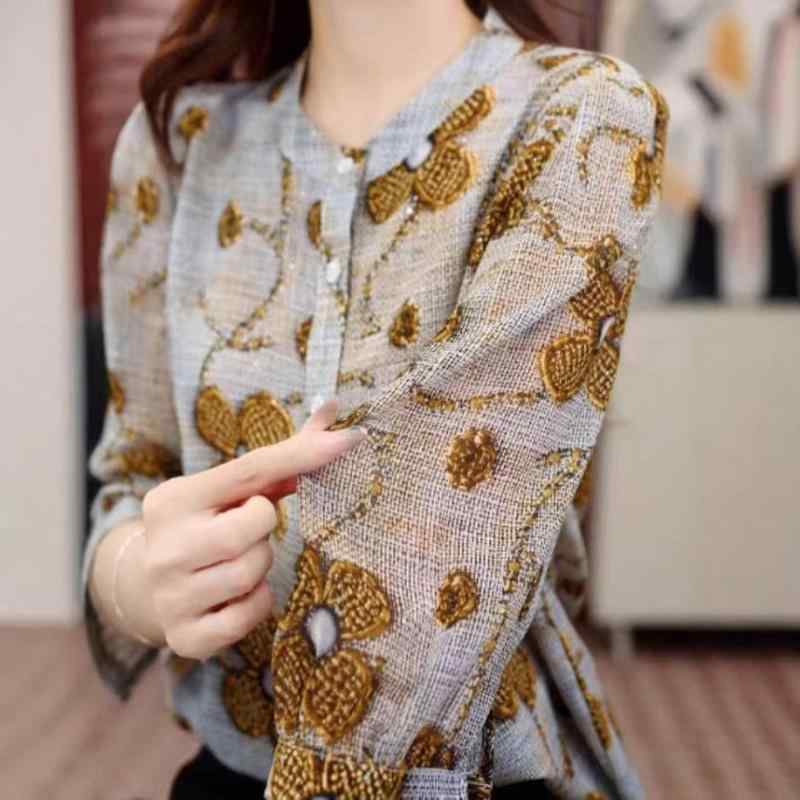ブラウス レディース ラウンドネック プリント柄 七分袖 トップス エレガント 上品 カジュアルスタイル おしゃれ 着回し 体型カバー ポリエステル素材 異素材切替 ブラウン系