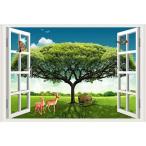 Mestiker 1本の緑の木 ウォールステッカー 偽窓 青空 白雲 緑の芝生 窓 草原 白い野の花 ニホンジカ