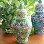 トルコ陶器 蓋つき壺 高さ25×直径11cm フラワーデザイン ターコイズブルー