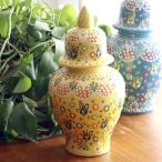 トルコ陶器 蓋つき壺 高さ25×直径11cm フラワーデザイン イエロー