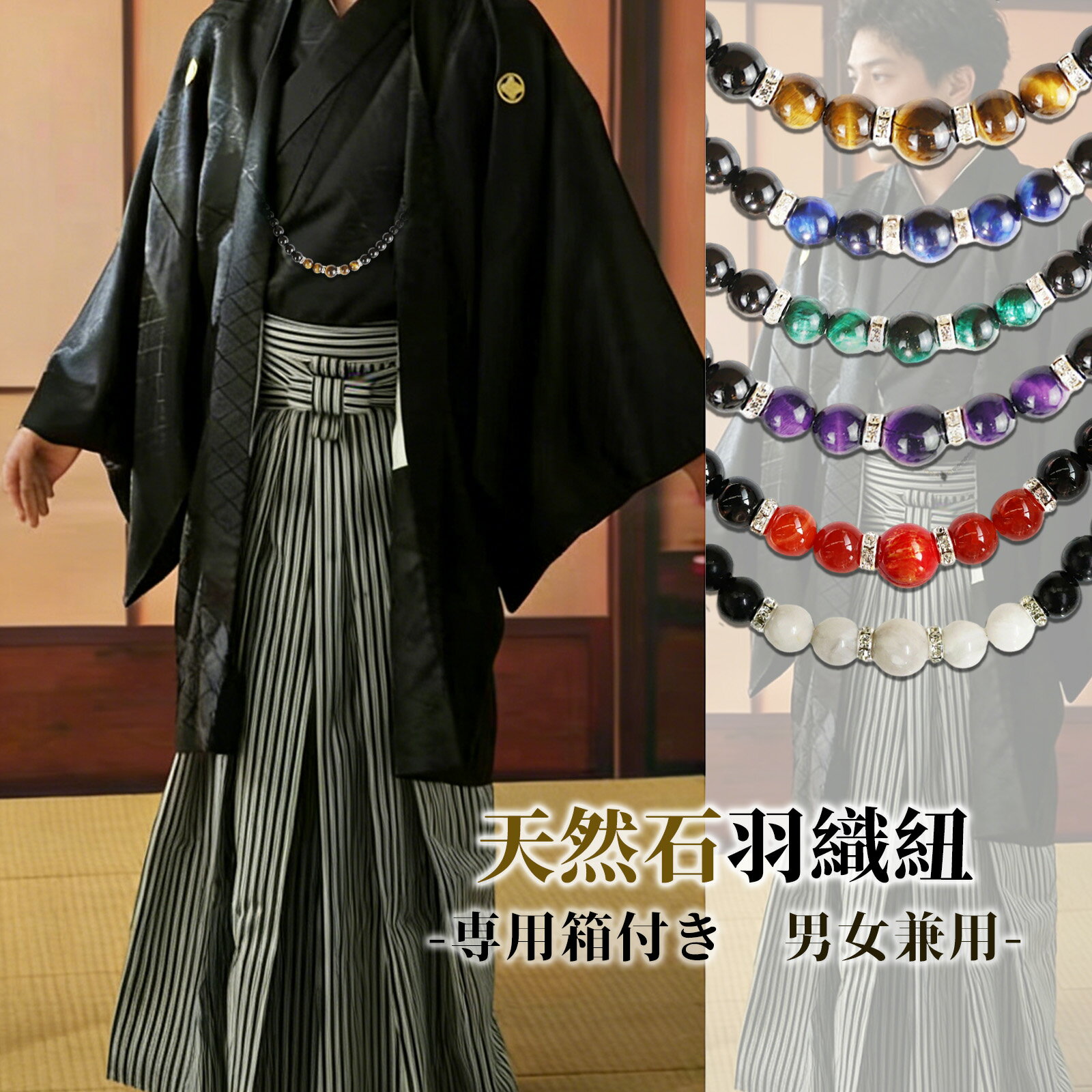 羽織紐 男女兼用 大人 天然石 瑪瑙 オニキス タイガーアイ パワーストーン カニ管 和装小物 着付け小物 通年用 プレゼント 卒業式 卒園式 2点セット(羽織紐 ギフトボックス)