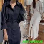 ワンピース シャツワンピース 七分袖 リボン紐付き ロング丈 ロング丈ワンピース ワンピ 新作 春 夏 レディース 大人 上品 無地 ロング カジュアル オフィス