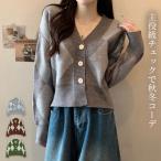 カーディガン レディース トップス 長袖 ショート丈 リブ Vネック きれいめ バイカラー ジャガード ニット 中厚手 ダイヤチェック 秋 冬