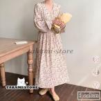 ワンピース ロング丈 花柄 シフォンワンピース 春 長袖ワンピース Vネック ロングワンピ マキシ丈 レトロ 花柄シフォンワンピ 秋 ドレス