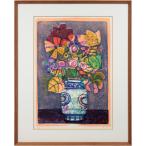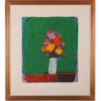 花 絵画 静物画 リトグラフ 版画 吉岡耕二 「緑の背景の花束」 額付き