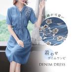 デニム ワンピース 夏 半袖 膝丈 きれいめ オシャレ ブラウス スタンドカラー シャツ レディース スリム効果 着やせ 花刺繍 立て襟 デニムシャツ ロング デニム