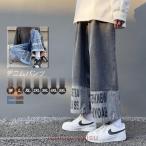 デニムパンツ メンズ ワイドパンツ ジーンズ 大きいサイズ 切り替え 英語柄 ゆったり ロング ストリート デザイン
