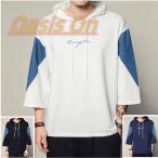 半袖パーカー メンズ 大きいサイズ 七分袖 薄手 フード付き 切り替え 英語柄 プリント おしゃれ カジュアル 涼しい