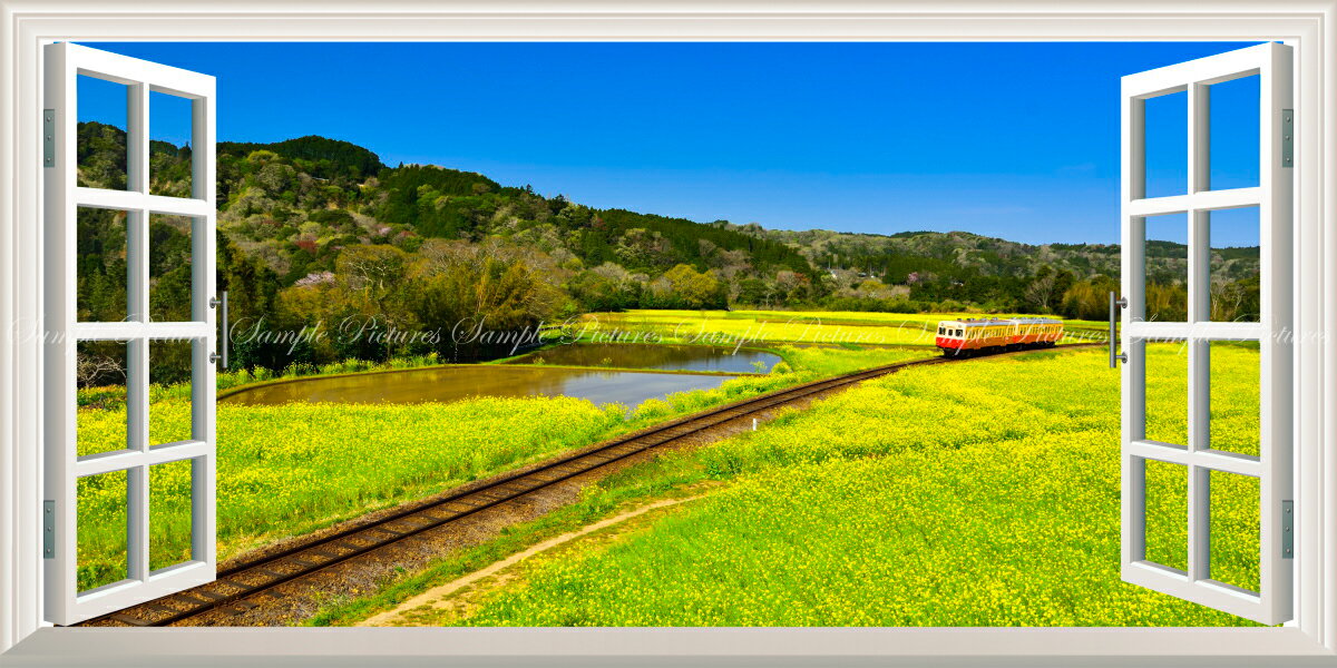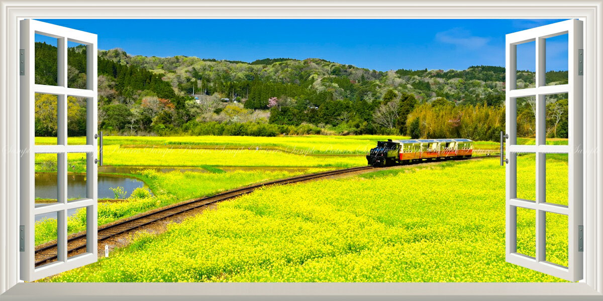 絵画風 壁紙ポスター (はがせるシール式) -窓の景色- -地球の撮り方- 小湊鉄道の菜の花畑を走るトロッコ列車 千葉県市原市 【窓仕様/トリックアート】 キャラクロ C-ZJP-082MS1 (パノラマS版 1152mm×576mm) <日本製> ウォールステッカー お風呂ポスター