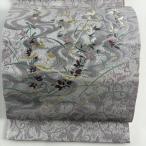 美品 袋帯 名品 葡萄唐草 草花 金糸 刺繍 灰紫 お太鼓柄 正絹 中古