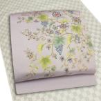名古屋帯 岡重 九寸 反物 薄藤色地 葡萄唐草 ぶどう 葡萄 唐草 正絹 浜ちりめん 岡重謹製 国産生糸100% 老舗 岡重 金 金彩加工 No.88-1750