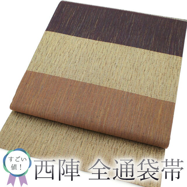 30%OFFで買えます¥19800→13860 【中古】 すごい値! 袋帯 リサイクル 京都 西陣 正絹 絹 全通 ラメ糸 金銀箔糸 こげ茶色 抹茶色 横段 カジュアル 春 秋 冬 仕立て上がり みやがわ neb00304