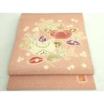 美品 袋帯 逸品 華文 花唐草 相良刺繍 茶色 六通 正絹 中古
