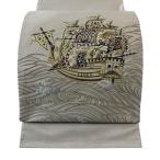 袋帯 逸品 蒋雪英 落款あり 帆船 波 相良刺繍 金糸 ベージュ お太鼓柄 正絹 中古
