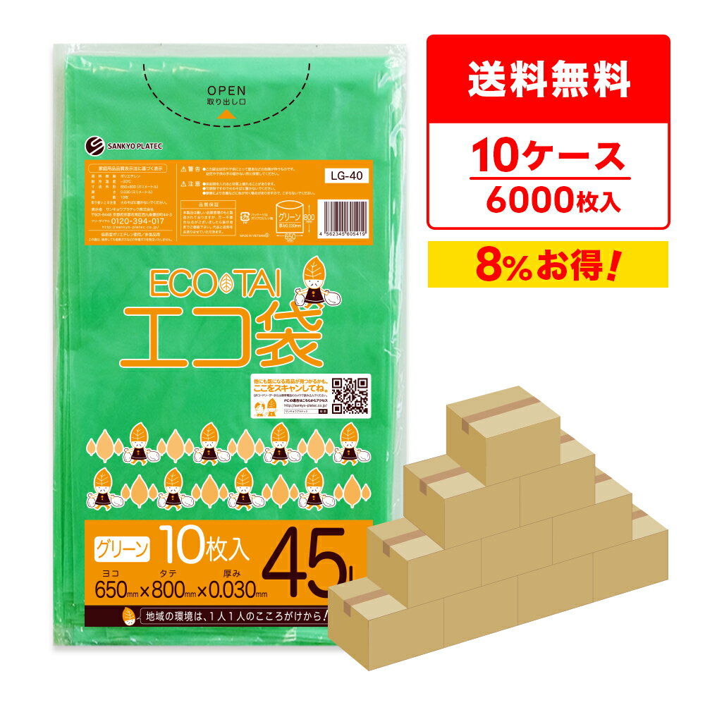 ごみ袋 45リットル グリーン 65x80cm 0.030mm厚 10枚x60冊x10箱 LG-40-10 ゴミ袋 ポリ袋 平袋 袋 45l 緑 分別 カラーポリ サンキョウプラテック 送料無料 まとめ買い 即納 即日発送 病院 介護 施設