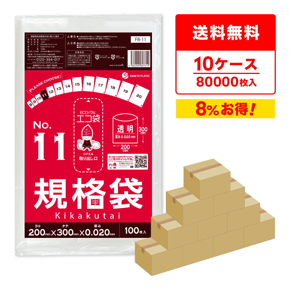 【まとめて10ケース】FB-11-10 規格袋 11号 0.020mm厚 透明 100枚x80冊x10箱 /ポリ袋 袋 保存袋 食品袋 平袋 食品用 検食 厨房 保育園 食品検査適合 RoHS指定 サンキョウプラテック まとめ買い 送料無料 即納