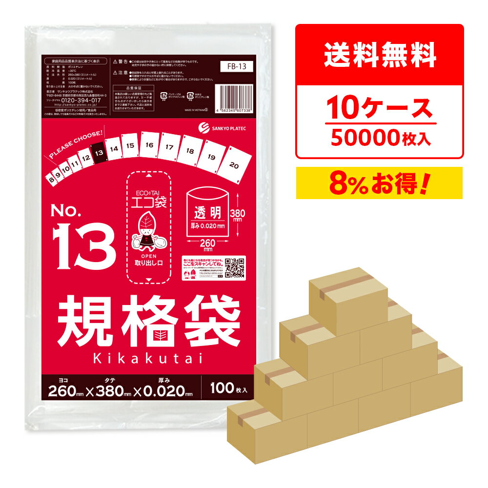 【まとめて10ケース】FB-13-10 規格袋 13号 0.020mm厚 透明 100枚x50冊x10箱 /ポリ袋 袋 保存袋 食品袋 平袋 食品 検食 厨房 保育園用 検食 食品検査適合 RoHS指定 サンキョウプラテック まとめ買い 送料無料 即納