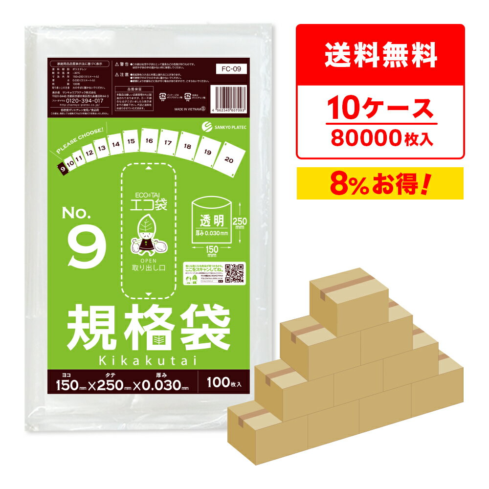 【まとめて10ケース】FC-09-10 規格袋 9号 0.030mm厚 透明 100枚x80冊x10箱/ポリ袋 袋 保存袋 食品袋 平袋 食品用 検食 厨房 保育園 食品検査適合 RoHS指定 サンキョウプラテック まとめ買い 送料無料 即納