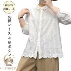 刺繍レース シャツ レディース 綿100% 貝ボタン シェル釦 刺繍 レース 花柄 フラワー 綿シャツ オフホワイト フェミニン ガーリー 大人可
