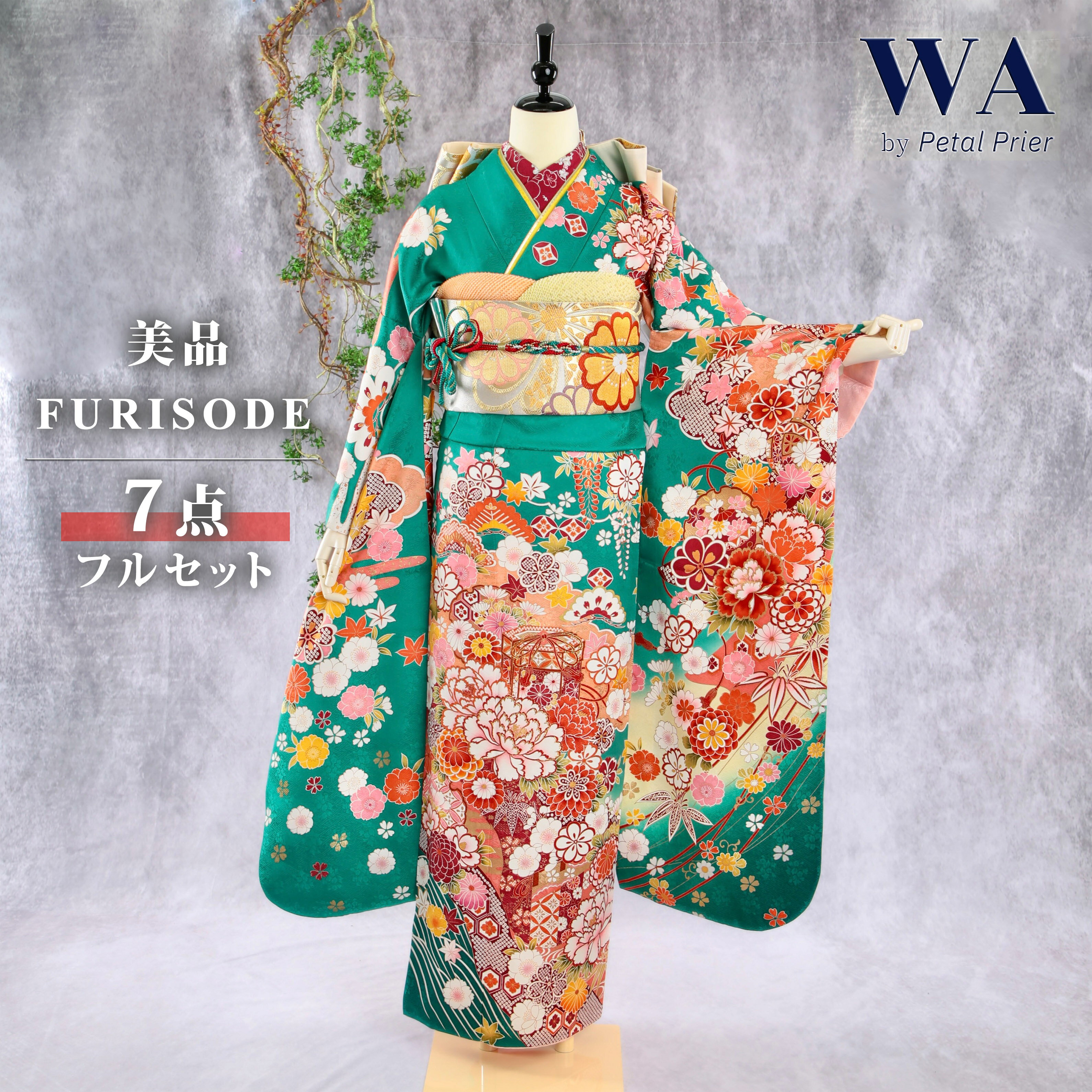 \30%OFF!/【中古】振袖 7点フルセット M〜Lサイズ 振袖セット 振袖フルセット フルセット 成人式 着物 晴れ着 緑 牡丹 貝桶 帯 帯揚げ 重衿 半衿 帯締め 結婚式 ブライダル 十三参り F-467