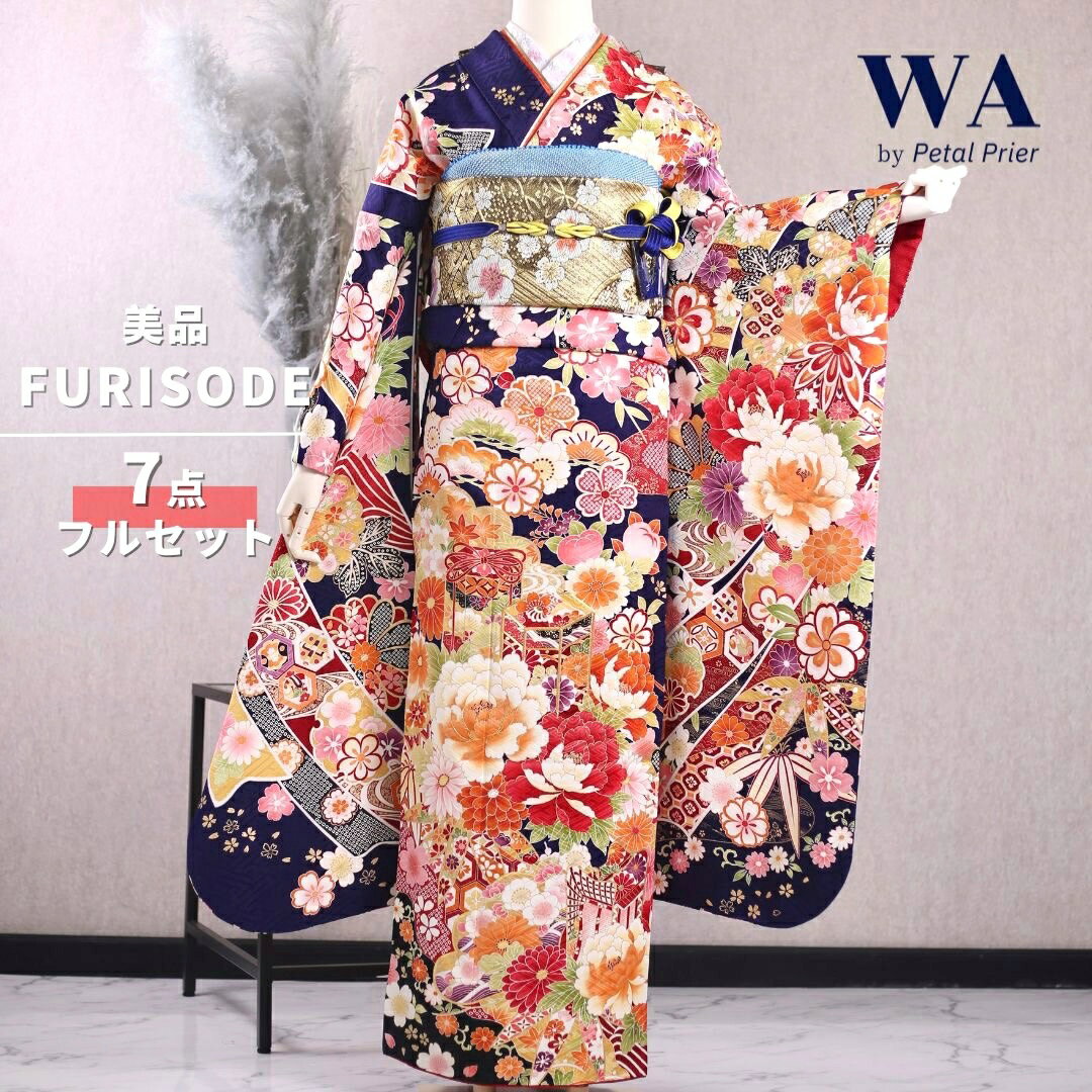\30%OFF!/【中古】振袖 7点フルセット Lサイズ 振袖セット 振袖フルセット フルセット 成人式 着物 晴れ着 青 紺 古典 古典柄 総柄 モダン 熨斗 牡丹 菊 貝桶 鹿の子 帯 帯揚げ 重衿 半衿 帯締め 結婚式 ブライダル 十三参り KF-149