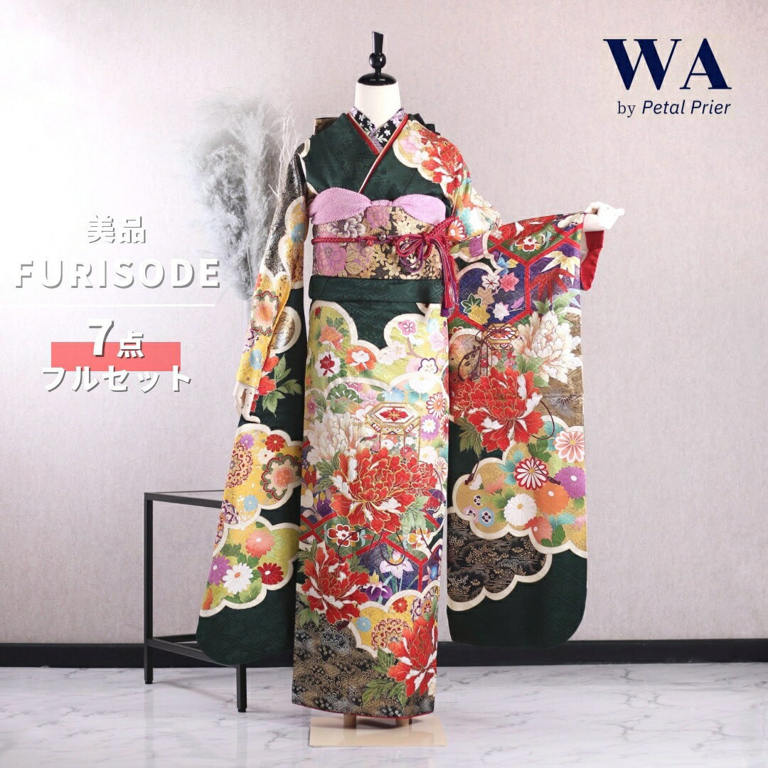 \30%OFF!/【中古】振袖 7点フルセット LLサイズ 振袖セット 振袖フルセット フルセット 成人式 着物 晴れ着 緑 深緑 古典 古典柄 モダン モード レトロ 雲取り 牡丹 貝桶 帯 帯揚げ 重衿 半衿 帯締め 結婚式 ブライダル 十三参り KF-177