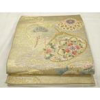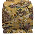 美品 袋帯 秀品 貝合わせ 鴛鴦 金糸 箔 黄土色 六通 正絹 中古