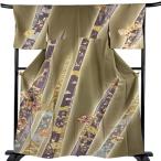 訪問着 身丈160.5cm 裄丈68.5cm L 袷 帝王紫 落款あり 扇面 松竹梅 刺繍 金糸 茶緑色 正絹 逸品 中古