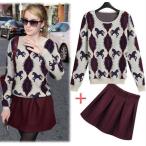 上下セットアップ レディース 40代 50代 秋 冬 秋冬 フェアアイル柄 丸首 長袖 ニット ミニスカート